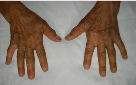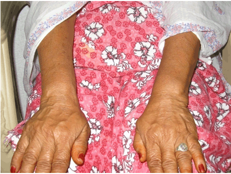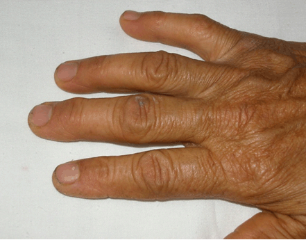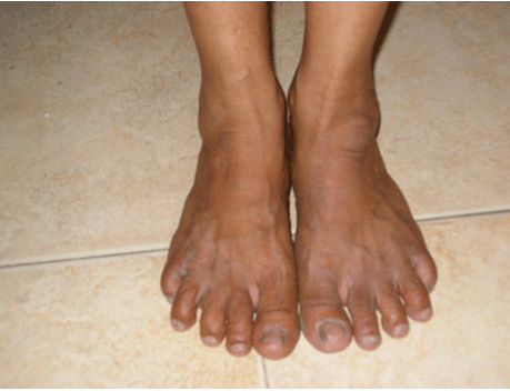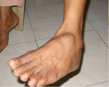 The tropical island of Mauritius in the Indian Ocean has experienced two chikungunya fever outbreaks with approximately 3600 and 11000 cases in 2005 and 2006 respectively [20]. In a study carried out 27.5 months after initial CHIKV infection on 173 individuals diagnosed using clinical criteria in an epidemic situation, 136 still had persisting joint and muscle symptoms of varying nature and intensity [16]. These manifestations were: joint pain at rest, joint pain on exertion, joint swelling, nodules near joints, joint deformity, morning stiffness, muscle weakness, paraesthesias and lymphadenopathy. The ankles and other joints of the feet were the most affected joints whilst the least affected one was the elbow. Further to the study [16], we had concluded that persisting symptoms were associated with older age at time of infection, female gender and baseline symmetrical distribution of joint symptoms. In addition, we had observed that 5% of those infected with CHIKV fulfilled a modified version of the American College of Rheumatology criteria for rheumatoid arthritis 27.5 months after infection. At the time of the study [16], visual evidence of the aftermath of CHIKV had also been collected with informed written consent obtained from the participants for the use of the clinical images.