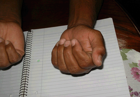 A 52-year-old male presented with no significant medical history prior to CHIKV infection. This patient had contracted CHIKV infection in April 2006 and suffered from severe arthralgia. Since then, the patient complained that his joint symptoms did not resolve completely and he was regularly experiencing pain, stiffness and swelling in knee, wrist and ankle joints. This patient had morning stiffness daily lasting 15–20 minutes. In addition, he complained of regular cramp-like tightening of muscles accompanied by severe pain at night. He also suffered from an inability to clench his fist in both hands as can be observed in Figure 7. He was also unable to grip objects; he had difficulty in holding the steering wheel of his car and thus had to give up driving. These symptoms had started since the CHIKV infection. The patient felt that his left side was more affected with joint pain and weakness. The patient also reported that the residual symptoms post-CHIKV infection had affected him considerably on a psychosocial level since these symptoms restricted his daily activities. Moreover, the patient complained of an unusual bony swelling on his left knee (Figure 8) following a period of prolonged joint swelling of his left knee after the CHIKV infection. On examination the swelling was hard, bony and non-tender. It restricted the range of movement at the knee especially during kneeling. It is to be noted that there was no prior history of knee injury. The swelling was diagnosed as a prominent tibial tuberosity on left knee which arose subtly after the CHIKV infection.
