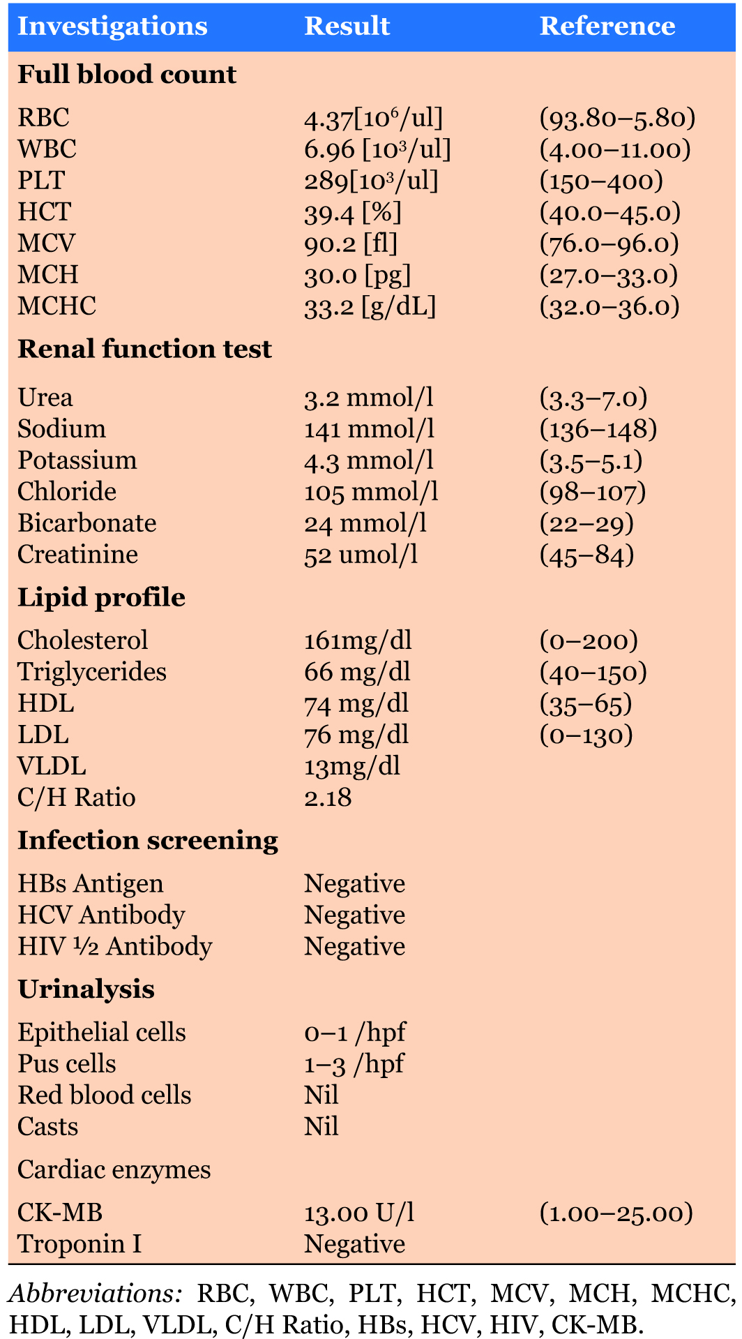 Initially, she was treated as costochondritis with diclofenac injection at a clinic which only offered a temporary pain relief and pain recurred after 2 hours. Upon further consultation with a respiratory physician, she was treated as pleuritis with analgesics and antibiotics. However, pain recurred after a few hours and not relieved with medications, thus she was admitted to a local private hospital for further evaluation. Upon admission, her general condition was fair and her vitals were normal (blood pressure: 110/60 mmHg, pulse rate: 68 per minute, temperature: 37°C and SpO2: 100% on air. On cardiovascular examination, first and second heart sounds were normal with no additional sounds. The other systemic examinations were also normal.