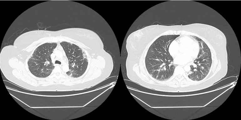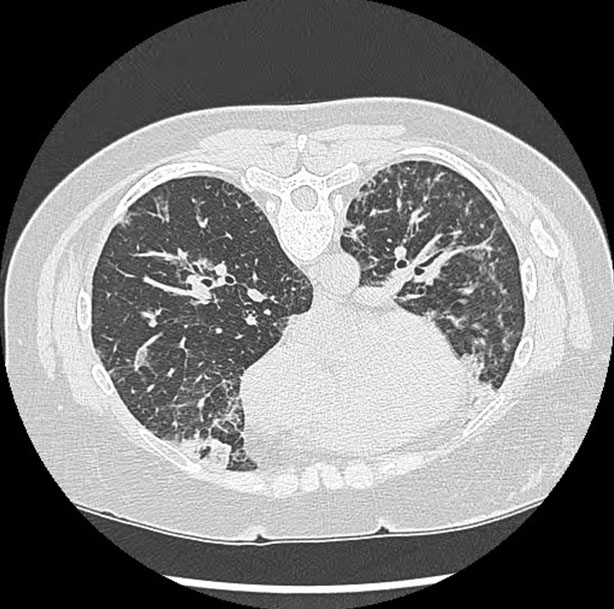 Radiologist: the chest CT without intravenous contrast (Figure 2) showed bilateral peripheral areas of consolidation and ground-glass opacities which persisted on the prone images. Septal thickening was present, primarily in the lung bases. Diffuse centrilobular nodules were noted as well. There was also apparent mediastinal adenopathy.