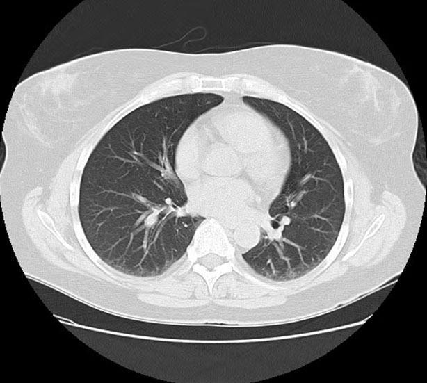 Pulmonologist: A chest X-ray from one week prior showed heart size and pulmonary vascularity within normal limits. There were multifocal ill-defined infiltrates seen in the right upper lobe, left upper lobe, and left lower lobe without definite peribronchial interstitial thickening to suggest reactive airways disease. No associated pleural effusions were identified. There may had been some bronchiectatic changes in the lingular region. Pulmonary function tests (PFTs) and chest CT were clinically warranted.