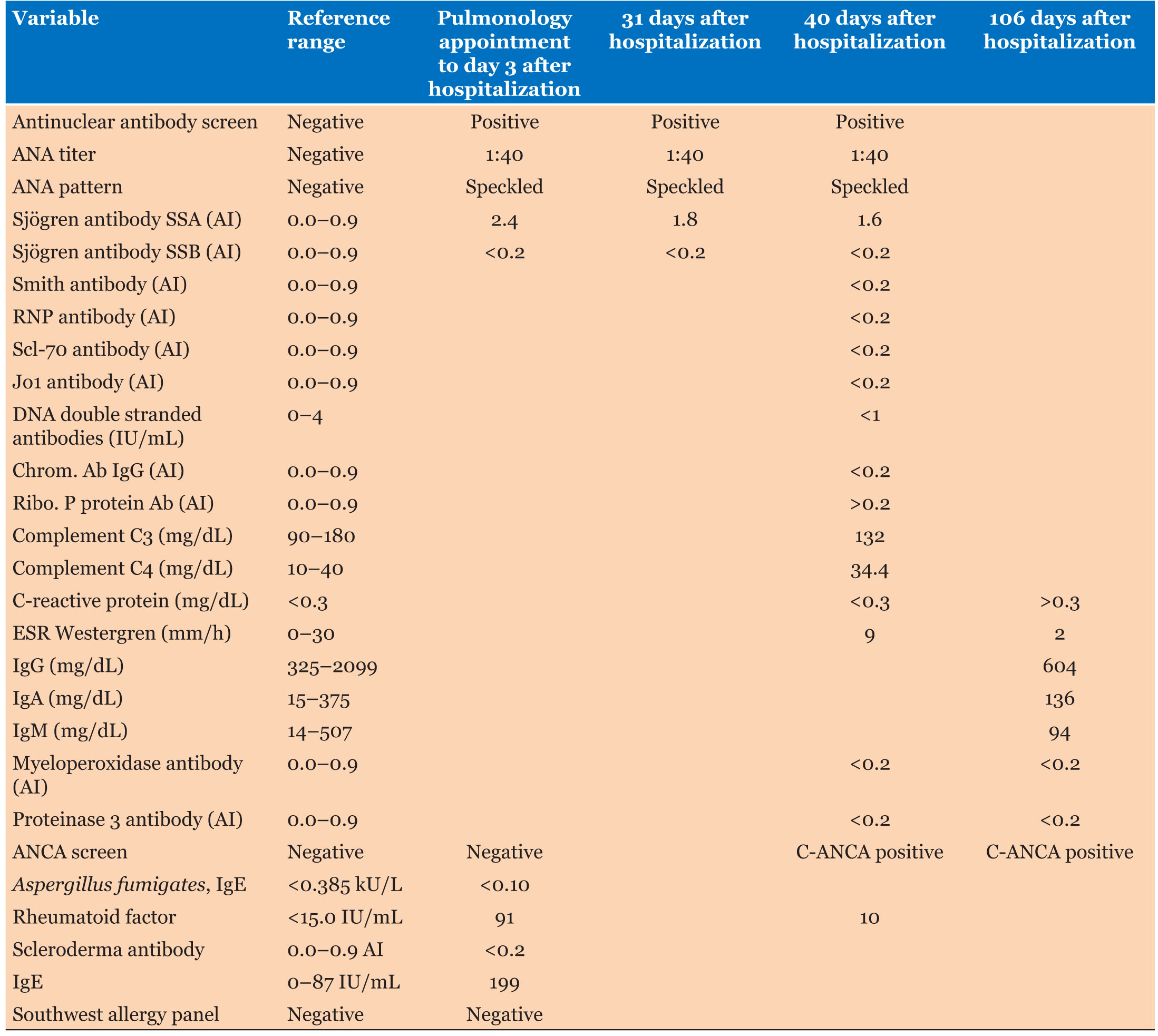 One day before the presentation, pulmonology workup done in the outside hospital did show positive rheumatoid factor (RF) and an immunoglobulin E (IgE) level of 199 IU/mL (reference range, 0–87) but negative antineutrophil cytoplasmic antibodies (ANCA) (Table 1).