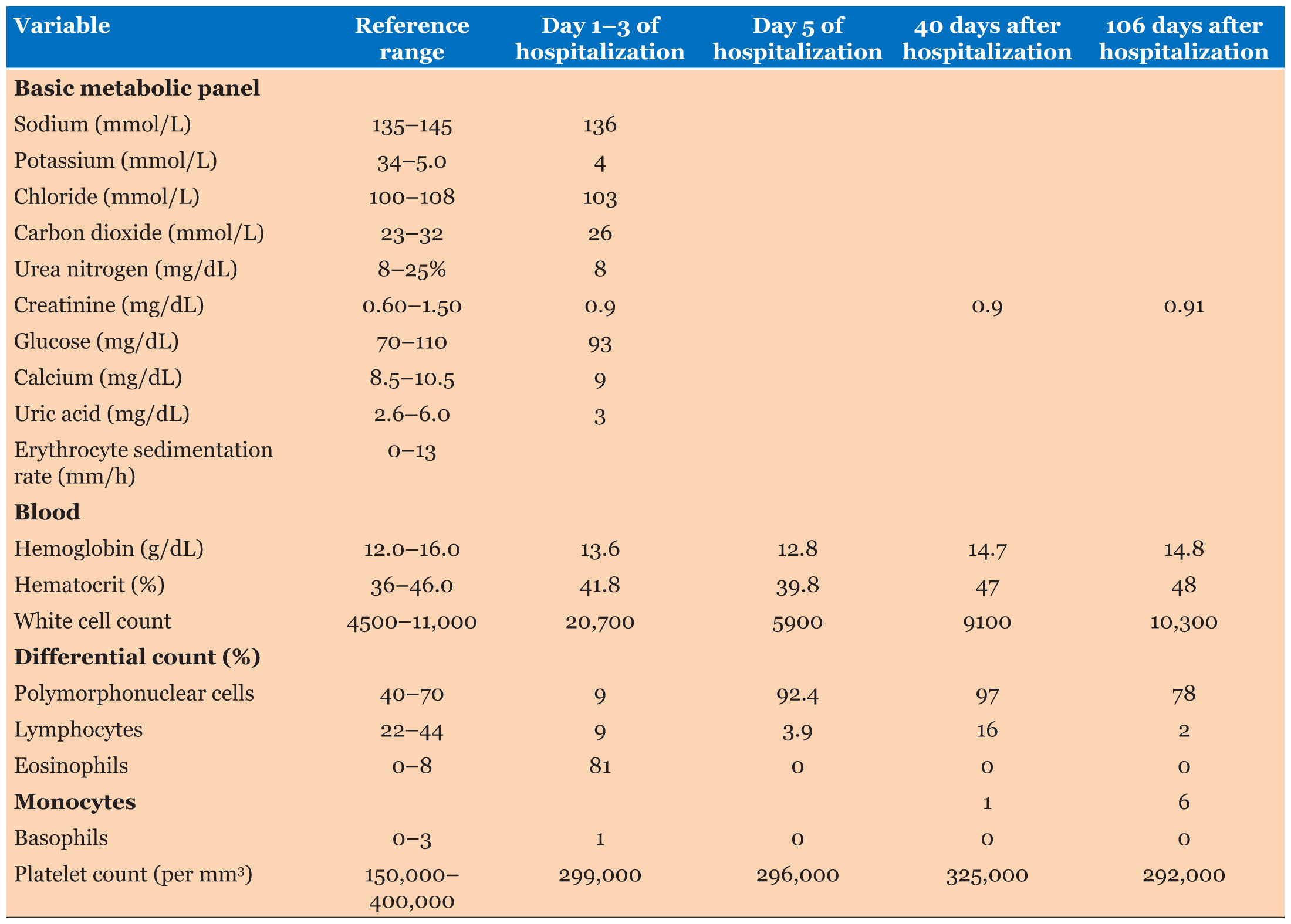 Labs showed significant increase in her white blood cell count at 20.7 with 81% eosinophils along with normal chemistries (Table 1 and Table 2).